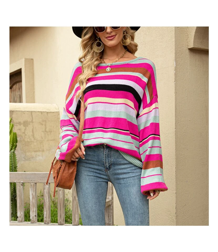 Casual Striped Pullover Crew Neck Loose Knit Sweater Wholesale Women Tops SSWV463760