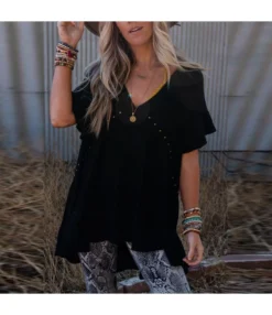 Loose Solid Color Rivets Deep V Hollow Stitching Top Wholesale Women’S Top N4623051900054