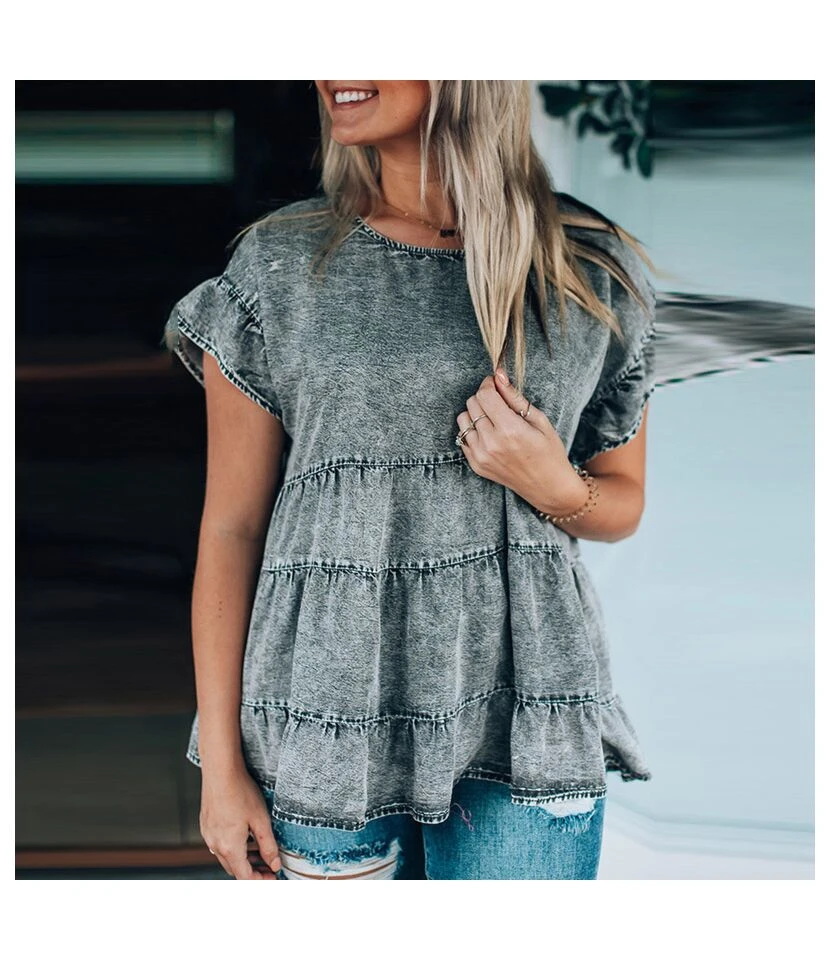 Denim Short Sleeve Pullover Round Neck Ruffle T-Shirt Wholesale Women’S Top N4623051900045
