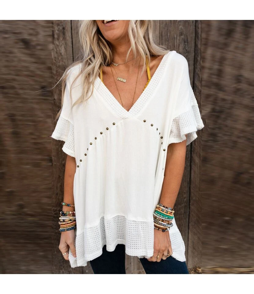 Loose Solid Color Rivets Deep V Hollow Stitching Top Wholesale Women’S Top N4623051900054