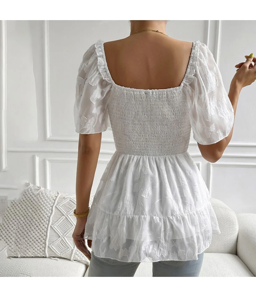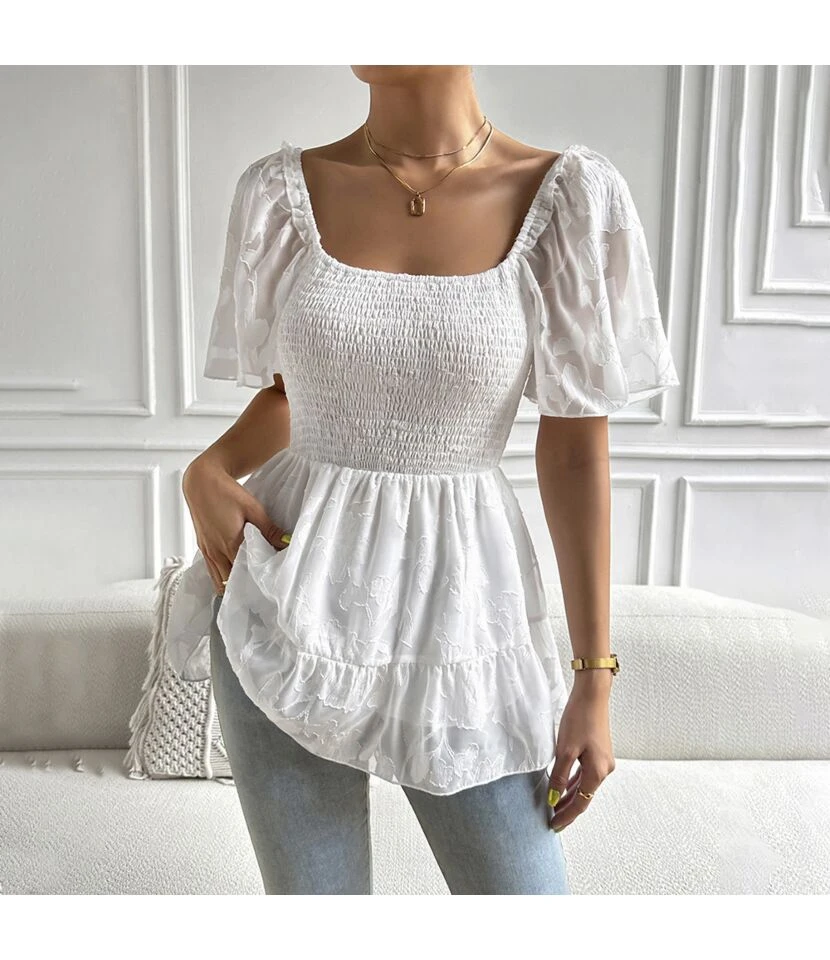 Pleated All-Match Square Collar Wraps Short-Sleeved Blouses Wholesale Women’S Tops N462623032300181
