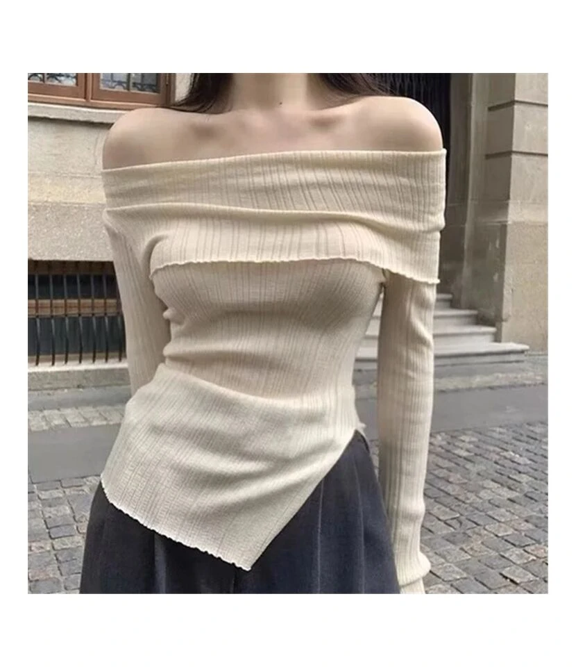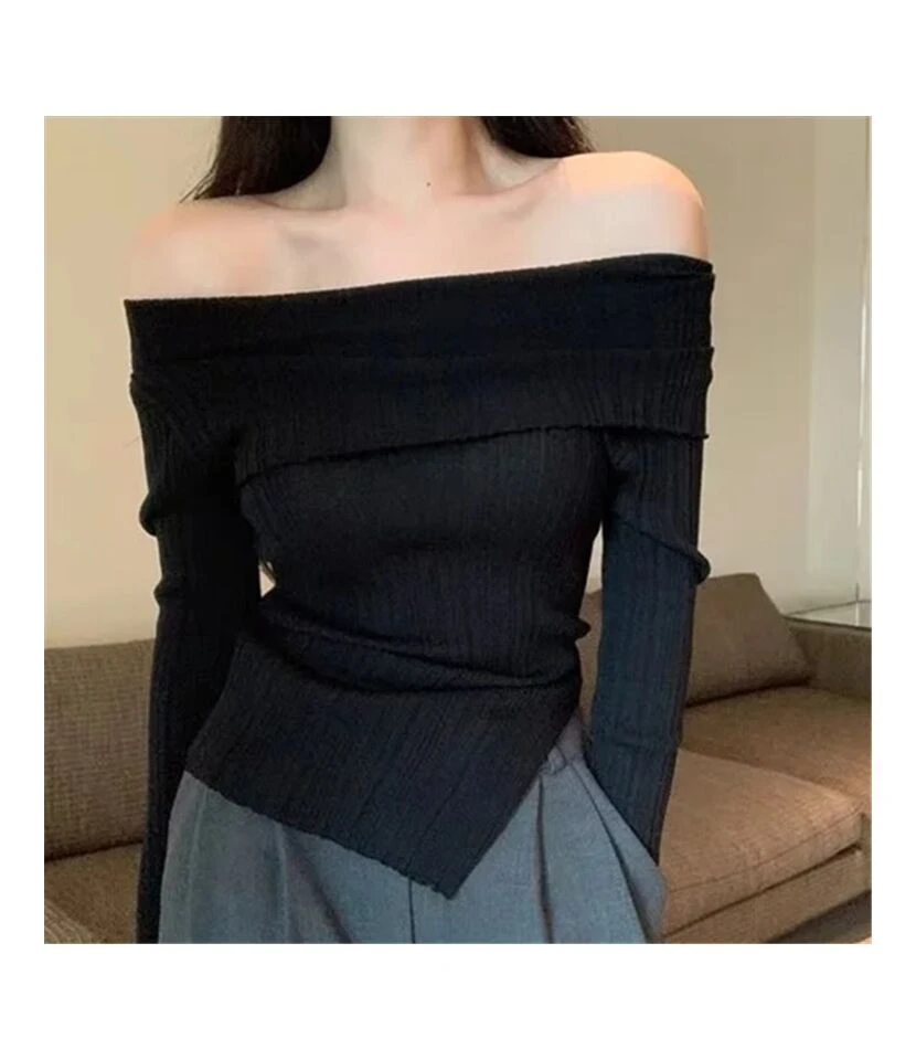 Knitted Simple Sexy One-Word Collar Slim-Fit Pullover Pleated Blouses Wholesale Women Top STV464000