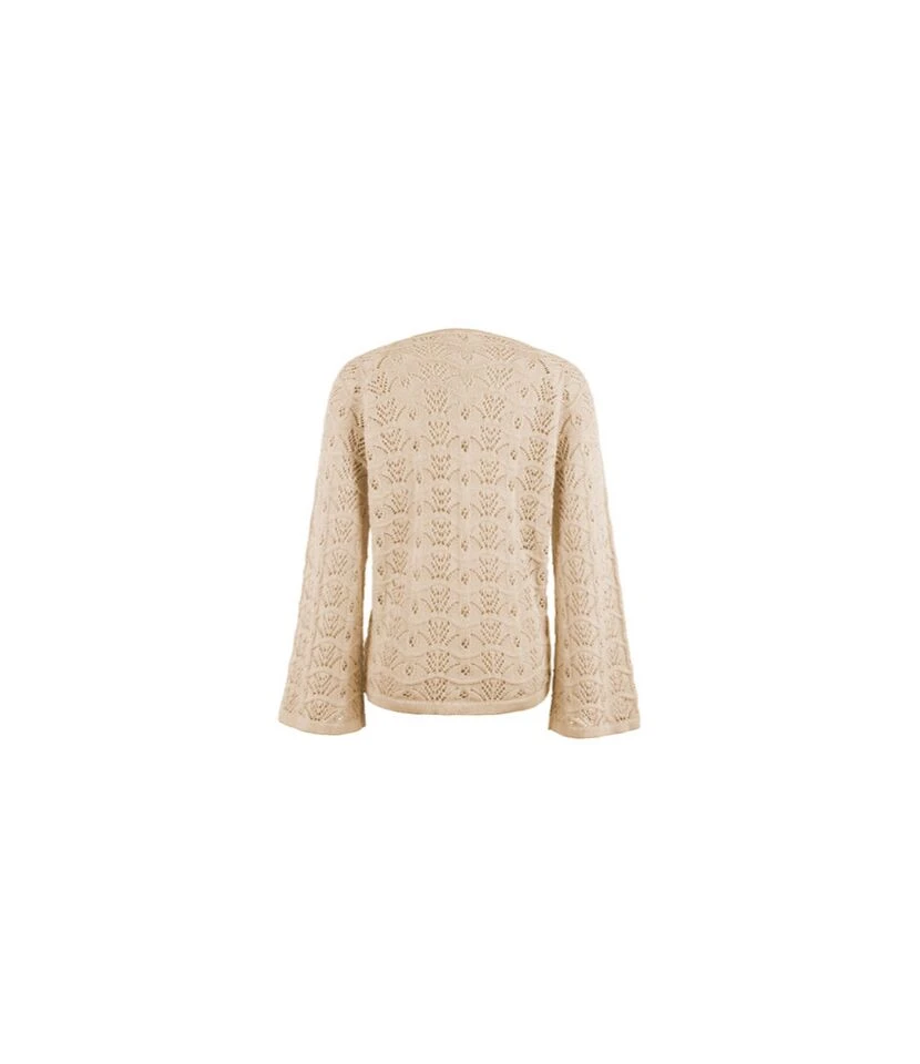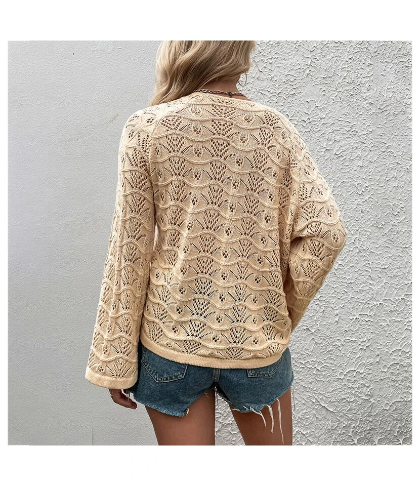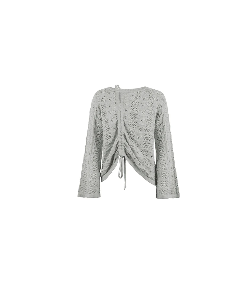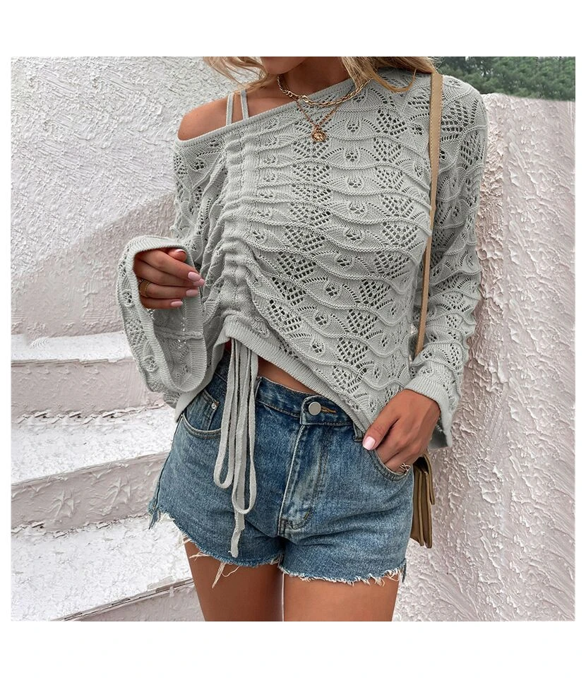 Sexy Hollow Out Drawstring Knit Top Solid Color Flared Sleeve Loose Wholesale Sweater SSWN561052
