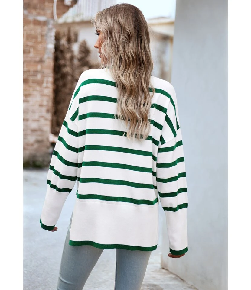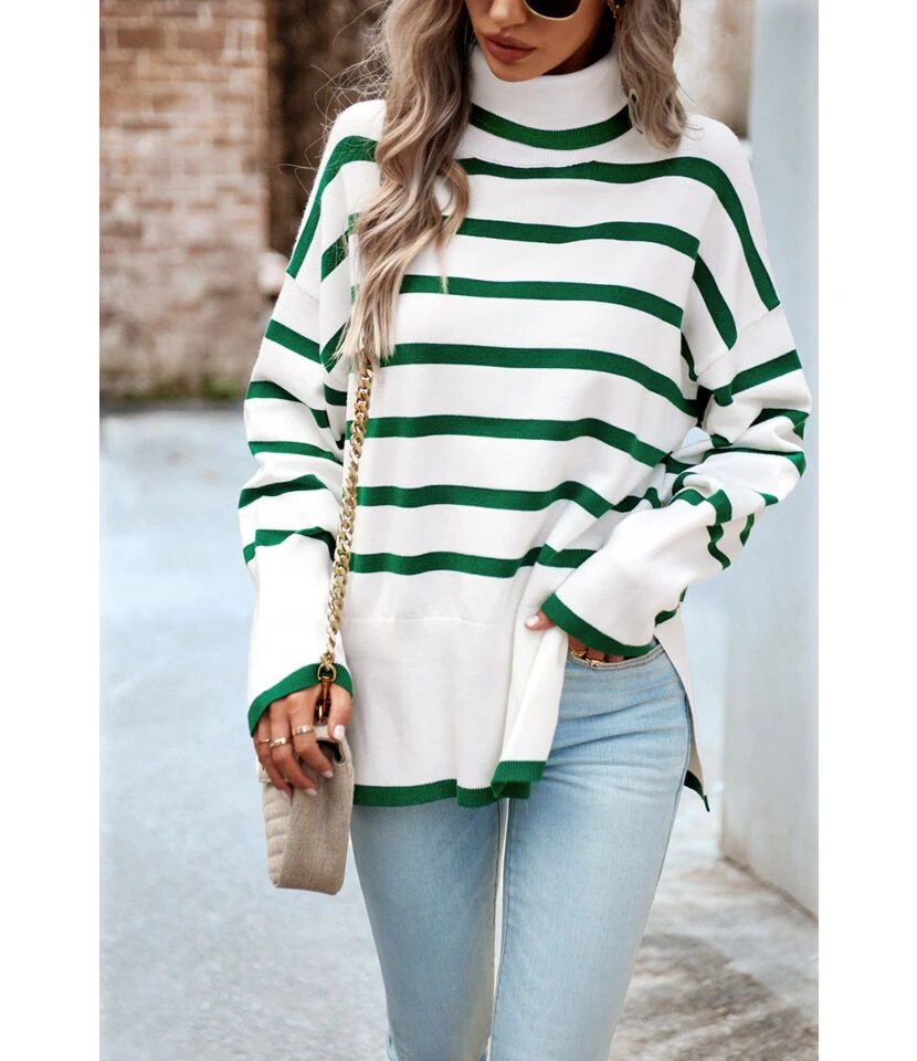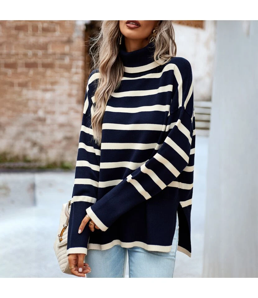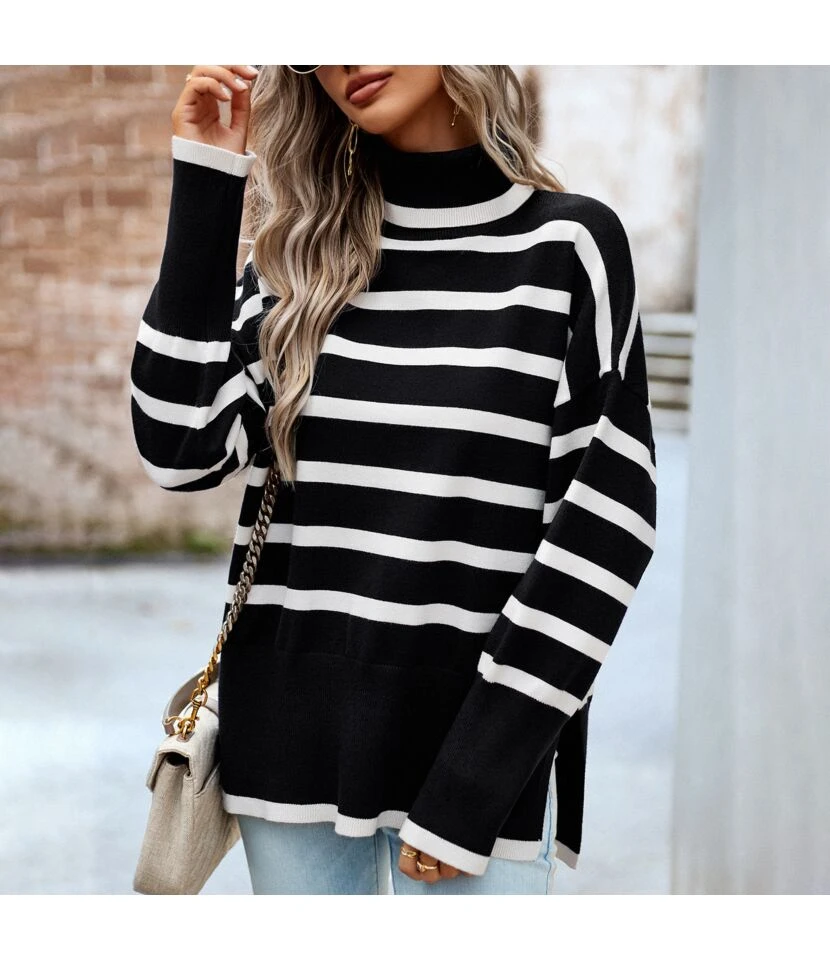 Striped Turtleneck Slit All-Match Knitted Sweater Wholesale Women’S Top N4623071700095