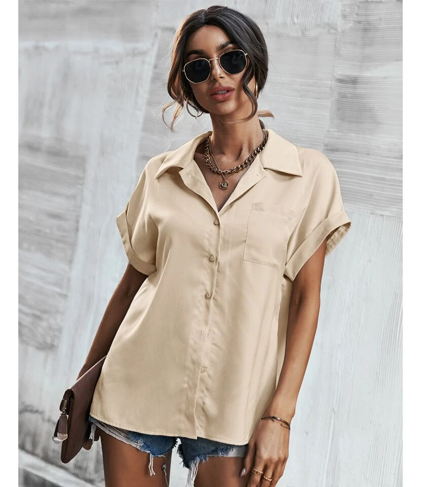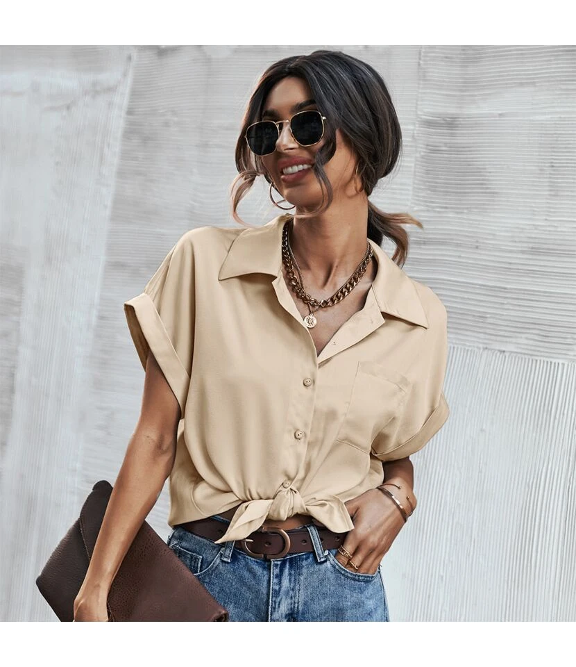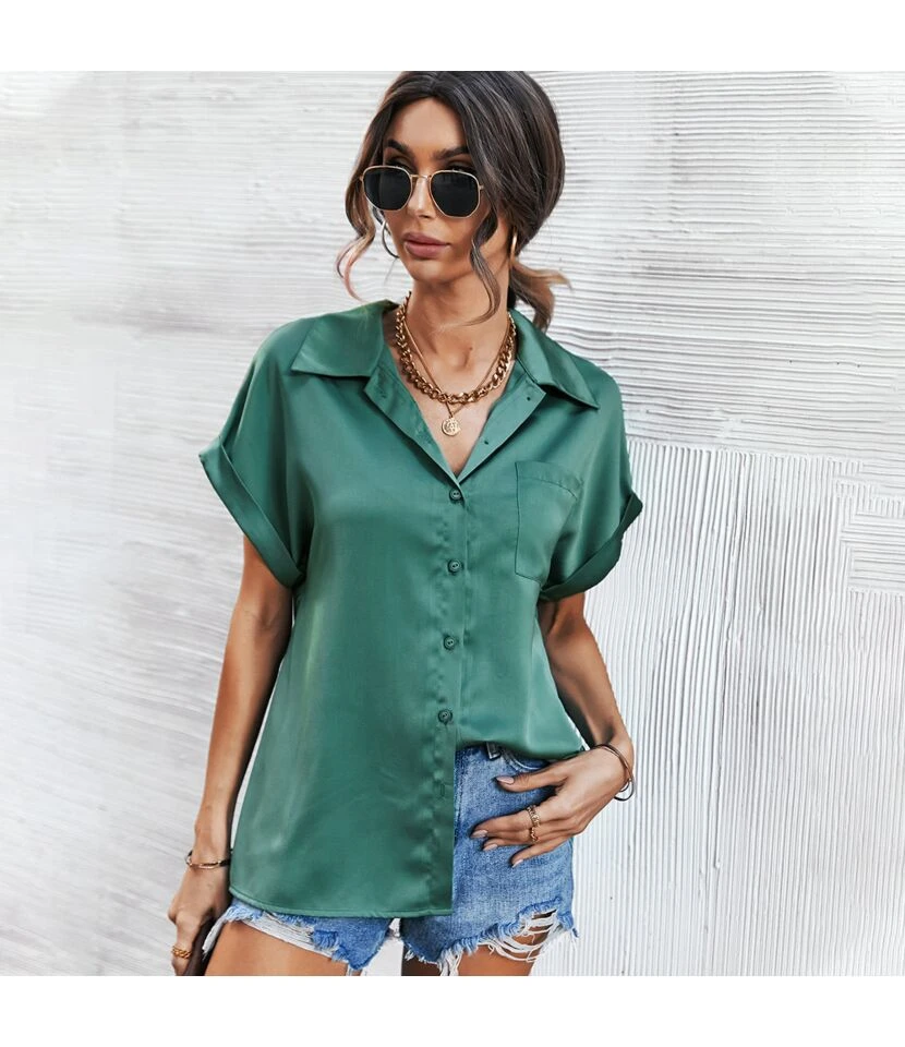 Summer Solid Color Short Sleeve Business Casual Womens Lapel Satin Shirts Wholesale Blouse STN533372